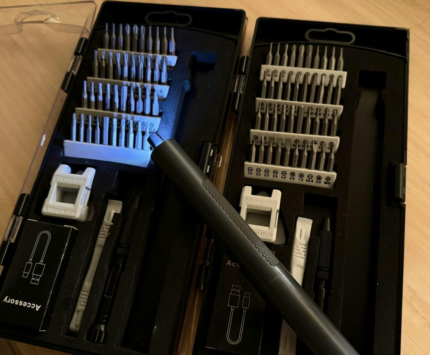 This electric screwdriver set includes 49 accessories: a variety of screwdriver bits, a magnetizer, pry tools, a USB charging cable, and storage boxes. If you are not satisfied with your purchase, please feel free to contact us.